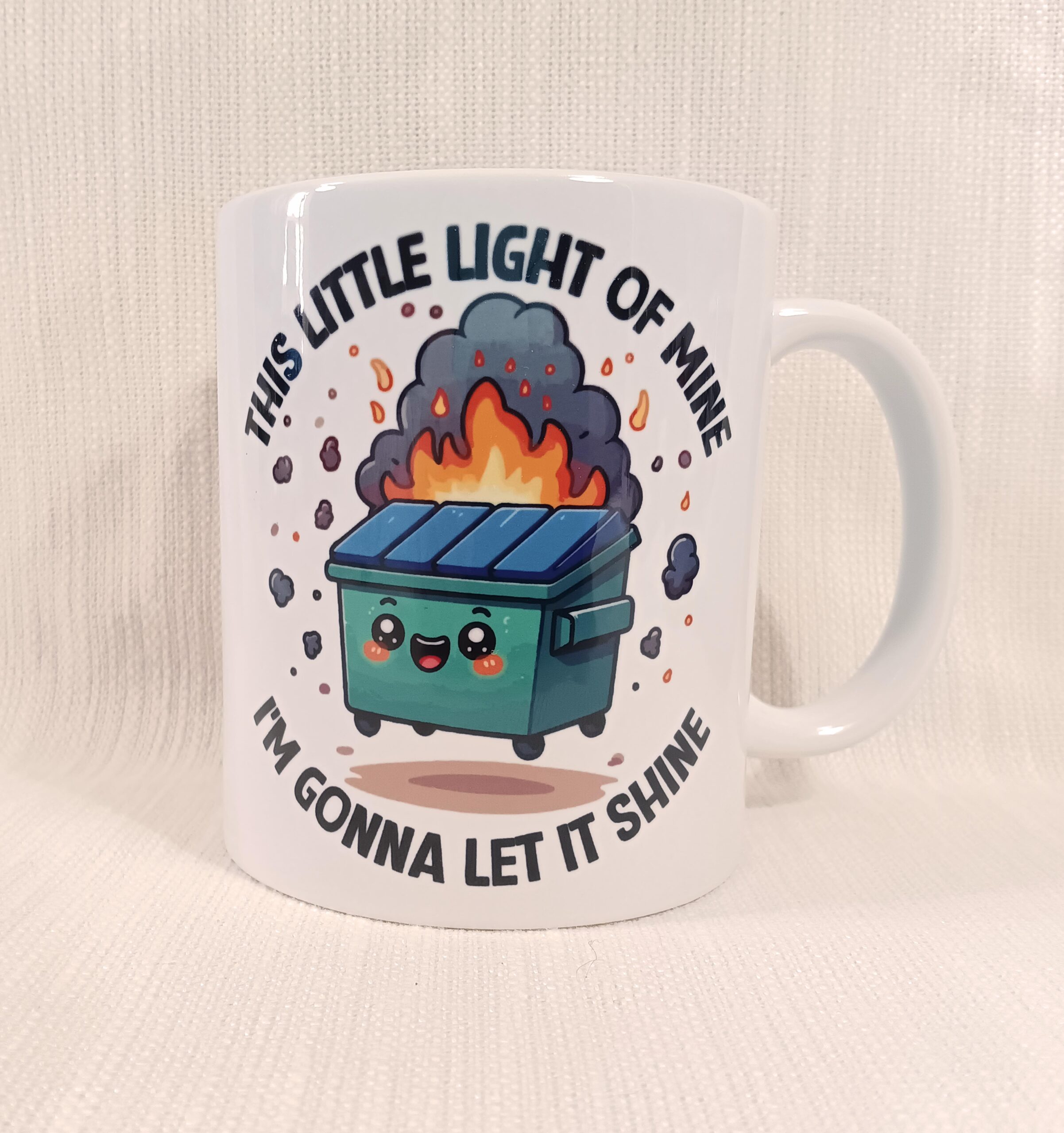 When Life’s a Dumpster Fire—Make It Shine. Embrace the chaos with a mug that gets it. Featuring a delightfully unbothered dumpster ablaze and the cheeky phrase “This Little Light of Mine, I’m Gonna Let It Shine,” this cup is your daily dose of dark humor and resilience. Perfect for those who laugh through the madness, sip through the stress, and sparkle anyway. Durable, dishwasher-safe, and guaranteed to turn heads—because some fires are worth flaunting. 🔥☕