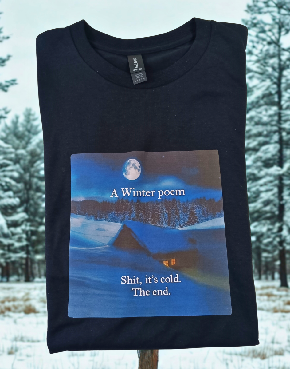 Roses are dead. Violets are frozen. This shirt says what we’re all thinking when the temperature drops: “Shit it’s cold. The end.” No metaphors. No fluff. Just pure, poetic suffering in cotton-blend form.
